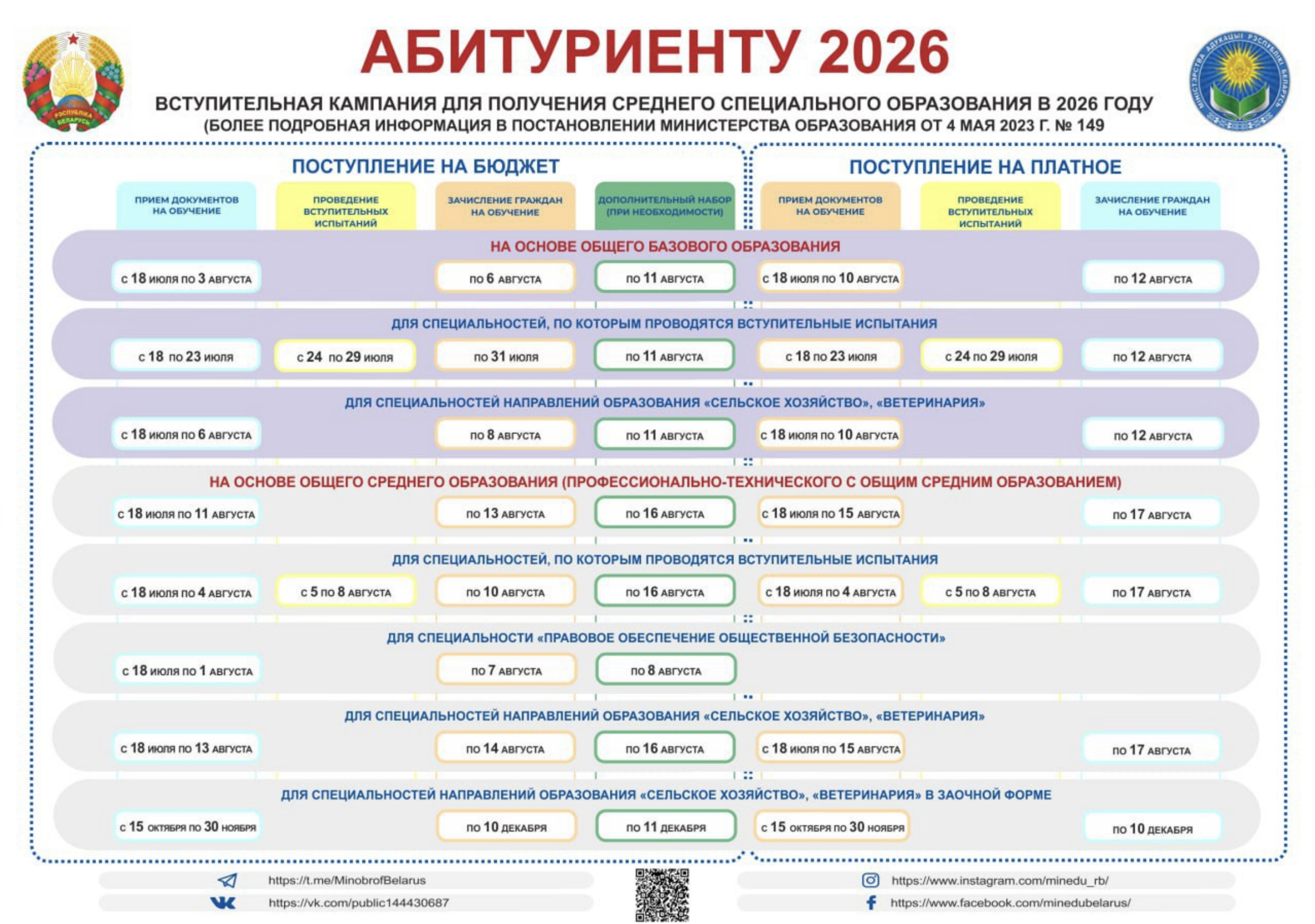 Министерство образования уточнило сроки приемной кампании в учреждения среднего специального образования на 2026 год. Инфографику опубликовали в официальном Telegram-канале ведомства.